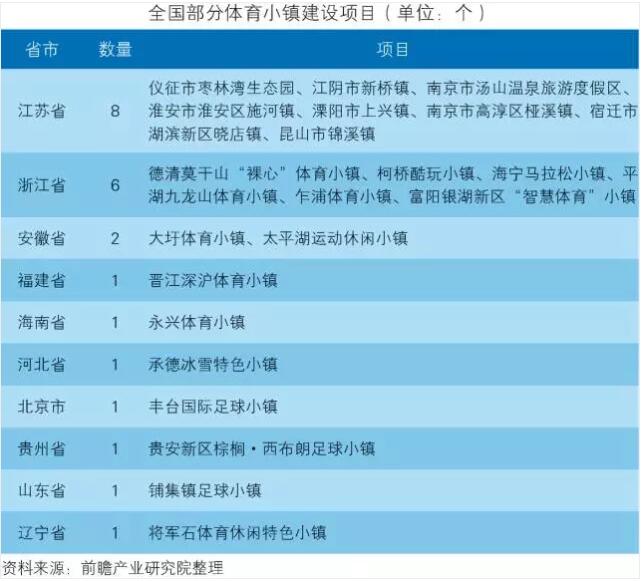 根据浙江省培育100个特色小镇的目标,截至2016年5月,浙江省政府已经公布了两批79个省级特色小镇创建对象、51个省级特色小镇培育对象中,以体育产业为主体的特色小镇就有5个,包括德清莫干山“裸心”体育小镇、柯桥酷玩小镇、海宁马拉松小镇、平湖九龙山体育小镇、乍浦体育小镇。